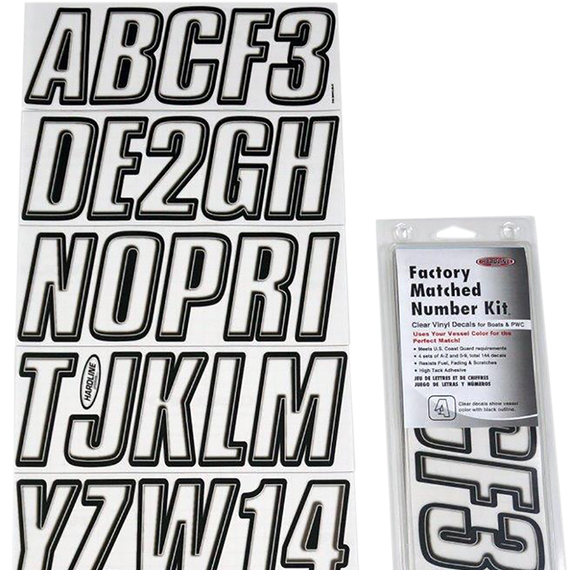 Caracteristicas: 3" H letter and number kits coordinate with your watercraft graphics for a killer look Kit contains 146 decals: four sets of A-Z, four sets of 0-9 and two Hardline Products decals