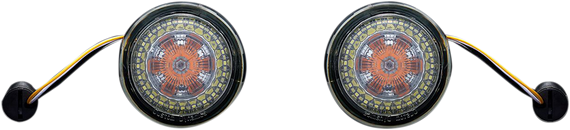 Caracteristicas: Premium Plug & Play LED front turn signals Uses advanced LED technology to maximize performance with a unique reflector technology and automotive grade LEDs composed into a sealed unit The outer ring of 24 white ProBEAM® LEDs showcase a smooth white halo that functions as the running light while 12 center amber LEDs function as the turn signal When a turn signal is activated the White LEDs turn completely off for the entire turn signal cycle providing greater visibility to the amber turn signal ProBEAM® Turn Signals include smoked lenses, are DOT and SAE Compliant