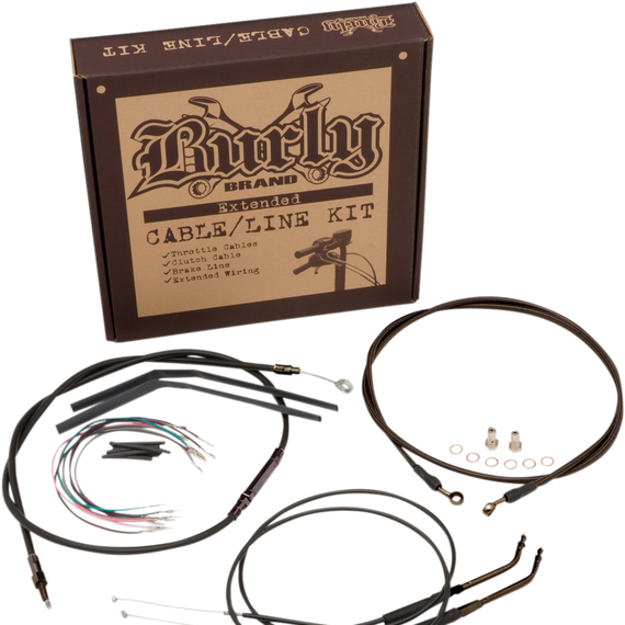 Caracteristicas: Complete installation kit for Burly Ape hangers Kits include extended brake line, extended clutch cable/clutch line, extended throttle/idle cables as required and all necessary wiring Brake lines feature PTFE inner liner and heavy-duty stainless steel outer braid Dresser kits reuse stock Throttle-By-Wire harness Kits are based on using 2" risers with ape hanger-style handlebars