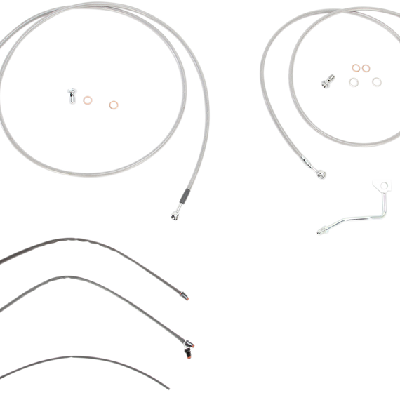 Caracteristicas: Complete installation kit for Burly Ape hangers Kits include extended brake line, extended clutch cable/clutch line, extended throttle/idle cables as required and all necessary wiring Brake lines feature PTFE inner liner and heavy-duty stainless steel outer braid Dresser kits reuse stock Throttle-By-Wire harness Kits are based on using 2" risers with ape hanger-style handlebars