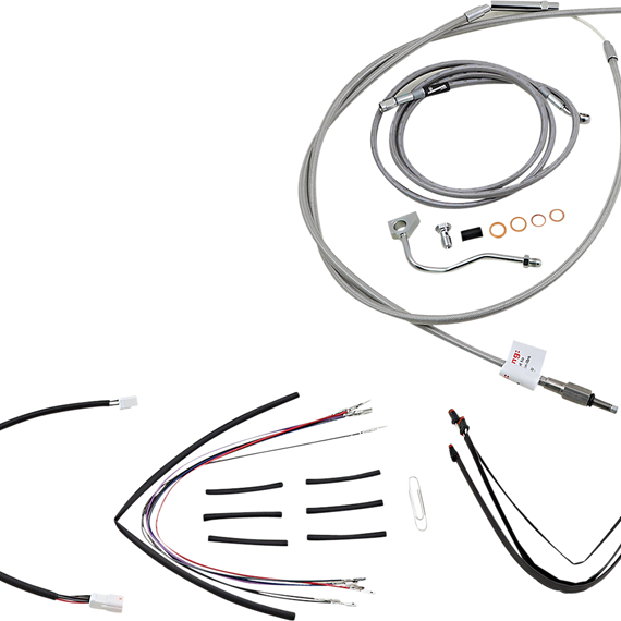 Caracteristicas: Complete installation kit for Burly Ape hangers Kits include extended brake line, extended clutch cable/clutch line, extended throttle/idle cables as required and all necessary wiring Brake lines feature PTFE inner liner and heavy-duty stainless steel outer braid Dresser kits reuse stock Throttle-By-Wire harness Kits are based on using 2" risers with ape hanger-style handlebars