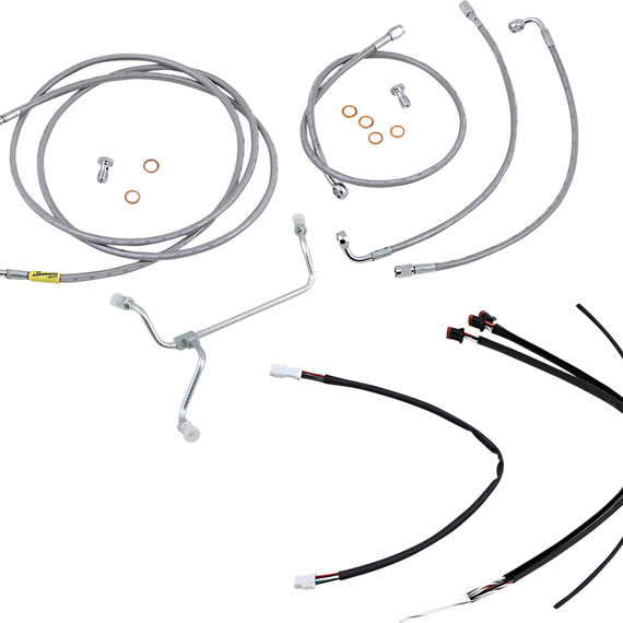 Caracteristicas: Complete installation kit for Burly Ape hangers Kits include extended brake line, extended clutch cable/clutch line, extended throttle/idle cables as required and all necessary wiring Brake lines feature PTFE inner liner and heavy-duty stainless steel outer braid Dresser kits reuse stock Throttle-By-Wire harness Kits are based on using 2" risers with ape hanger-style handlebars