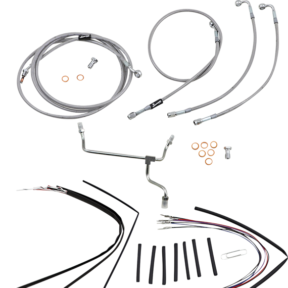 Caracteristicas: Complete installation kit for Burly Ape hangers Kits include extended brake line, extended clutch cable/clutch line, extended throttle/idle cables as required and all necessary wiring Brake lines feature PTFE inner liner and heavy-duty stainless steel outer braid Dresser kits reuse stock Throttle-By-Wire harness Kits are based on using 2" risers with ape hanger-style handlebars