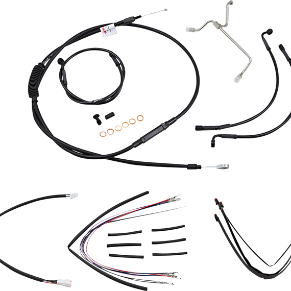Caracteristicas: Complete installation kit for Burly Ape hangers Kits include extended brake line (unless noted), extended clutch cable/clutch line, extended throttle/idle cables as required and all necessary wiring Brake lines, when included, feature PTFE inner liner and heavy-duty stainless steel outer braid Dresser kits reuse stock Throttle-By-Wire harness Kits are based on using 2" risers with ape hanger-style handlebars