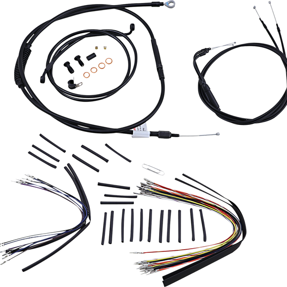 Caracteristicas: Complete installation kit for Burly Ape hangers Kits include extended brake line (unless noted), extended clutch cable/clutch line, extended throttle/idle cables as required and all necessary wiring Brake lines, when included, feature PTFE inner liner and heavy-duty stainless steel outer braid Dresser kits reuse stock Throttle-By-Wire harness Kits are based on using 2" risers with ape hanger-style handlebars