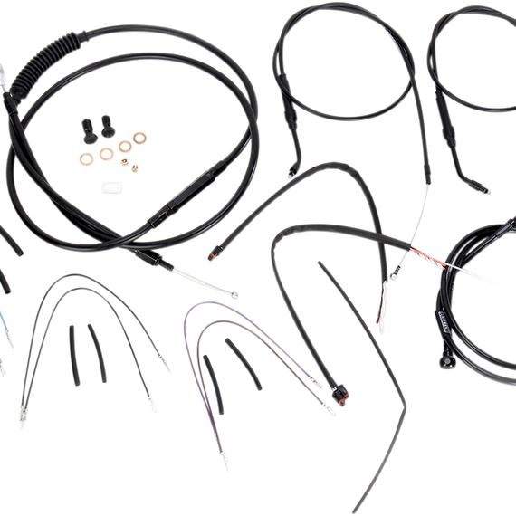 Caracteristicas: Complete installation kit for Burly Ape hangers Kits include extended brake line (unless noted), extended clutch cable/clutch line, extended throttle/idle cables as required and all necessary wiring Brake lines, when included, feature PTFE inner liner and heavy-duty stainless steel outer braid Dresser kits reuse stock Throttle-By-Wire harness Kits are based on using 2" risers with ape hanger-style handlebars