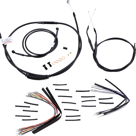 Caracteristicas: Complete installation kit for Burly Ape hangers Kits include extended brake line (unless noted), extended clutch cable/clutch line, extended throttle/idle cables as required and all necessary wiring Brake lines, when included, feature PTFE inner liner and heavy-duty stainless steel outer braid Dresser kits reuse stock Throttle-By-Wire harness Kits are based on using 2" risers with ape hanger-style handlebars