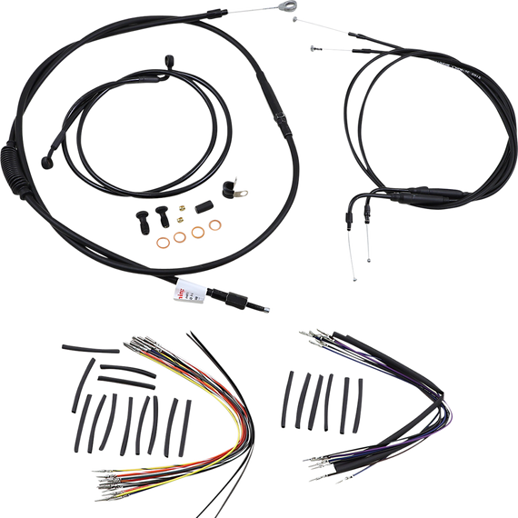 Caracteristicas: Complete installation kit for Burly Ape hangers Kits include extended brake line (unless noted), extended clutch cable/clutch line, extended throttle/idle cables as required and all necessary wiring Brake lines, when included, feature PTFE inner liner and heavy-duty stainless steel outer braid Dresser kits reuse stock Throttle-By-Wire harness Kits are based on using 2" risers with ape hanger-style handlebars
