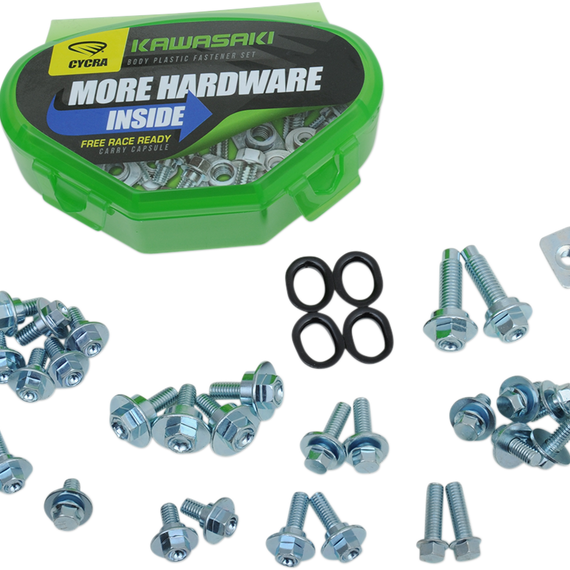 Caracteristicas: Designed to help you maintain and restore your bike 10.9 OEM grade & original factory configuration for precise fit Includes bolts for front fender, rear fender, fork guards, side panels, front number plate, seat and radiator shrouds (and air box on applicable models) Race Ready Carry Capsule included for convenience & organization Fitment spans multiple years and models, thus bonus hardware may result based on which year/model fastener kit is applied to
