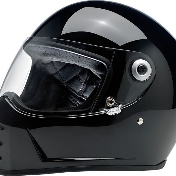 Caracteristicas: Biltwell proprietary ABS outer shell with hand-painted finish Shock-absorbing expanded polystyrene inner shell Hand-sewn removable brushed Lycra liner w/ contrasting diamond-stitched quilted open-cell foam padding Hand-stitched interior padding, cheek pads and Bio-Foam chin bar cushion for comfort Generous vents in the chin bar get the air flowing and the outlet in back lets hot air escape Shield boasts extremely accurate optics and simple hinge mechanics for high style and easy removal for replacement or cleaning Mesh pockets are included in the ear recess--perfect for aftermarket drop-in communication systems (not included) Injection-molded face shield with the same aluminum hinge covers and mounting hardware
