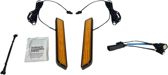 Caracteristicas: Replace the Harley-Davidson® OEM front fork reflectors on models with dual front brake calipers Super bright dual intensity amber LEDs, provide enhanced side visibility with run & turn functions to make you safer on the road Units are pre-taped to adhere in place of OEM reflector Plug and play wire harness for simple installation