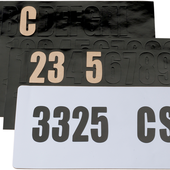 Caracteristicas: Included white background measures 4” L x 7-1/2” H Kit includes two sets of black number decals and one set of black letter decals Please check state and local laws before ordering