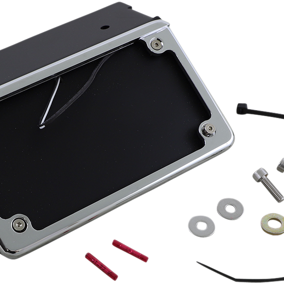 Caracteristicas: Gets rid of the large, unattractive sub-fender and huge license assembly Integrated one-piece hidden mounting platform places your license on a sweeping angle Exposes more of your fat rear tire to give your bike an aggressive look Sculpted chrome license frame with integrated dynamic LED lighting included Recessed turn signal mounts allow use of custom indicator lights or stock turn signals All hardware and do-it-yourself instructions are included for easy installation Made in the U.S.A.