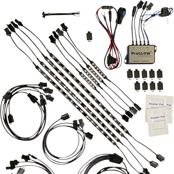 Caracteristicas: Covers engine and ground effects The innovative app connects to IOS or Android providing Bluetooth control of your lights at your fingertips Kit includes 4 ProGLOW™ 15 LED Strips and 4 ProGLOW™ 6 LED Strips Kit includes complete installation supplies, wire splitters, extensions and end caps Required ProGLOW™ 5V Bluetooth Controller is included