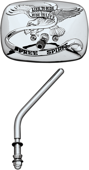 Caracteristicas: High-quality die-cast mirrors feature "Live to Ride...Ride Free" script Allen wrench for setscrew, chromed acorn nut and necessary mounting hardware included Mirror face measures approximately 5" x 3-3/4"