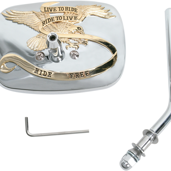 Caracteristicas: High-quality die-cast mirrors feature "Live to Ride...Ride Free" script Allen wrench for setscrew, chromed acorn nut and necessary mounting hardware included Mirror face measures approximately 5" x 3-3/4"