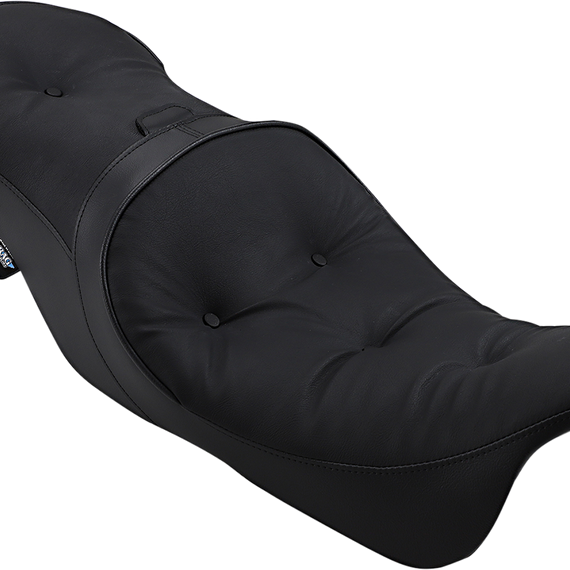 Caracteristicas: Solar-reflective leather in the seating area and automotive-grade vinyl on the sides; patented process reduces surface temperature by as much as 25° F for a cooler seat, higher durability and longer life over conventional leather or vinyl The driver area is cut narrow in the front and is approximately 1" lower than the stock seat Molded flexible urethane foam interior for maximum comfort 3/16" ABS thermoformed base for a perfect fit Carpeted bottom with rubber bumpers to protect paint Large touring seat with new styling and improved shape for added comfort Accept driver backrest (sold separately) Also work with H-D® OEM frame mounted mechanism and backrest pad Include all mounting hardware Made in the U.S.A.