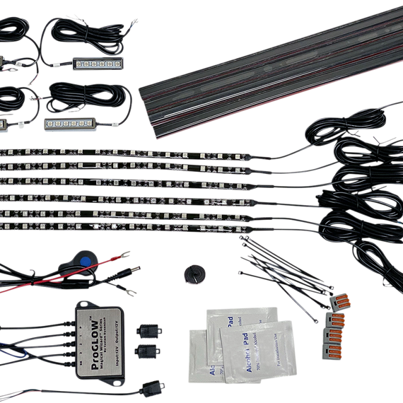 Caracteristicas: 60" wire leads that can be cut to length for a custom installation without any excess wire under the seat Each Magical Wizards™ light is wired independently to the included ProGLOW™ Bluetooth Controller for Magical Wizards™ Includes installation supplies and quick connectors Includes six 15 LED strips and four 6 LED pods Universal, 12 VDC systems