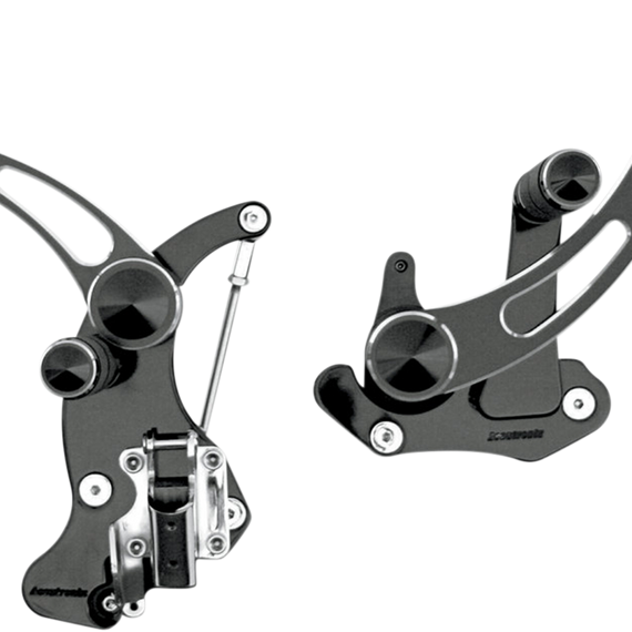 Caracteristicas: CNC-machined from 6061 T-6 aluminum 3/4" mounting plates for superior strength Feature sealed bearings on the pivot points for smooth operation and no maintenance Assembled with chrome hardware, kit comes ready to install Used with existing stock master cylinder Includes foot and toe pegs, mounting hardware and instructions Made in the U.S.A. When installing extended forward controls, check fender clearance before operating.