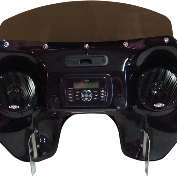 Caracteristicas: Mediazilla Fairings give you the higher level in sound and comfort you deserve Pull-out drawer conceals USB plug and aux input cord Waterproof drawer keeps your electronic devices dry and out of sight Integrates with the OEM windshield mounting stampings, using included hardware Includes Jensen JHD40BT stereo system Includes 3.5mm "mini-jack" auxiliary patch cord to plug into MP3/GPS or other listening devices Includes USB input port for use with memory stick devices and includes two 12V power sockets for charging/running accessories Handlebar control is die cast aluminum and waterproof with rubberized buttons Includes 12" clear windshield; will accept 96-13 FLHT OEM style and aftermarket replacement windshields (sold separately) (some drilling and trimming may be required) Equipped with four 5" speakers Black radio faceplate Concealed internal antenna for a clean, uncluttered appearance Superb wind protection and great audio with a classic appearance Made of hand-laid fiberglass - stronger than ABS plastic and only 34 lb. complete Made in the U.S.A.