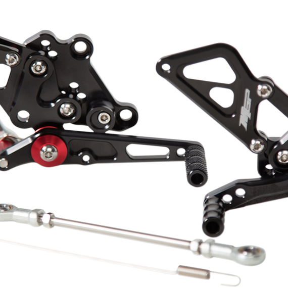 Caracteristicas: CNC machined from aircraft grade T6 6061 billet aluminum Fully adjustable to suit your riding style Mounting bracket and brake light switch spring included Supports OEM brake light switch Fully assembled and easy to install Knurled foot pegs with plastic caps Most applications can be converted to GP shift Complete kit - no additional parts required Ships fully assembled