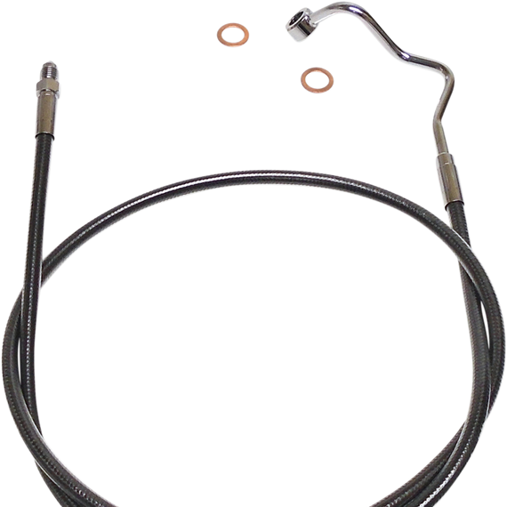 Caracteristicas: Manufactured with an enhanced construction designed to be compatible with Harley-Davidson® ABS requirements for stock and alternate length brake lines Brake kits consist of a direct fit lower assembly used in conjunction with alternative length upper lines AN-3 connections make for easy installations Braid color and weave match all Magnum control cables and brake lines Crystal clear outer jacket offers exceptional protection against scuffing paint or chrome and will never discolor Inner PTFE tubing braided with Aramid Fiber reinforcement provides the ultimate in high performance by greatly reducing line expansion Brake lines are constructed with PTFE inner tubing, DuPont™ Kevlar® aramid fiber, premium signature magnum braids and an outer PVC jacket Compliant with all DOT FMVSS-106 specifications Assembled in the U.S.A.