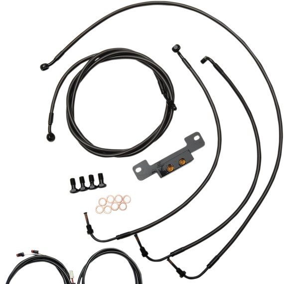 Caracteristicas: Kits include the correct length braided brake/clutch lines and wire extensions to complete a handlebar swap Black "T" brake line junction, banjo bolts, fittings and copper crush washers included Made in the U.S.A. Kits are based on using 2" risers with Ape Hanger handlebars