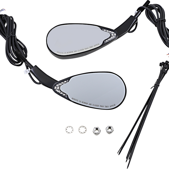 Caracteristicas: Two rows of forward-facing bright white/amber LEDs behind a smoke lens White DRL LEDs automatically deactivated when the turn signal lamp or hazard warning lamp is activated Built-in rear-facing red LEDs, also behind a smoked lens, can be wired to illuminate as turn signal or brake light Mirror head dimensions: 5-1/8" wide x 2-9/16" tall Mirror stems position heads 2-1/2" out and 5-1/2" above mounting location Wire concealed in mounting stem Requires 5/16" mounting hole Mounting hardware included DOT compliant mirror glass