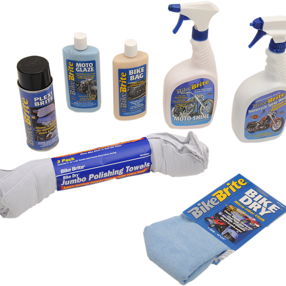 Caracteristicas: Everything you need to keep your bike looking like new in an easy-to-carry case Includes one 32 oz. bottle of Bike Brite® Motorcycle Spray Wash, one 14 oz. can of Plexi Brite®, one 12 oz. bottle of Bike Bag® Leather and Vinyl Conditioner, one 12 oz. bottle of Moto Glaze®, one 32 oz. bottle of Moto Shine®, three Bike Dry® Polishing Towels, and one Bike Dry® Micro Fiber Cloth. Available 3 per case Made in the U.S.A.