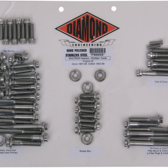 Caracteristicas: Designed to provide a custom and detailed look with easy installation Five groups of fasteners will detail all your engine covers with a lasting shine Includes fasteners for primary, inspections, and inner primary, cam and points, oil pumps or oil line cover, lifter blocks, and rocker boxes Made in the U.S.A.