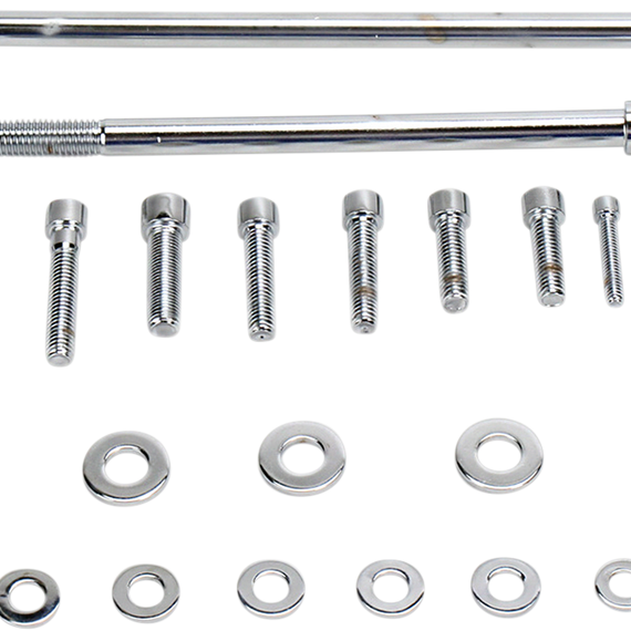 Caracteristicas: Kits feature polished stainless steel or polished chrome steel socket-head bolts Motor sets for Twin Cam include cam cover, primary cover, transmission side cover, oil hose cover, lifter base, rocker box, front inner primary, washer, motor and transmission mount bolts Motor set for M-Eight includes cam cover, primary cover, transmission covers, electric module cover, lifter base, rock boxes, top front motor mount and rear motor mount Side cover set include cam, primary, oil hose cover and transmission side cover Primary set include primary, inspection and derby cover Made in the U.S.A.