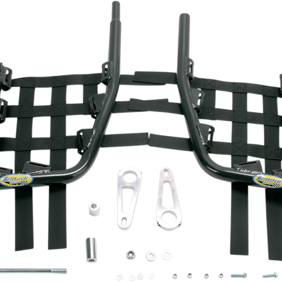 Caracteristicas: Manufactured from lightweight 1-1/4" extruded aluminum tubing Custom EZ-fit clamp brackets with silver anodized finish Wide 1-1/2" black webbing with beefy aluminum net tabs Sweep up from front to the rear for maximum ground clearance Maximum width of 50" to comply with ATVA rules Allows the use of OEM heel plate/fender extensions
