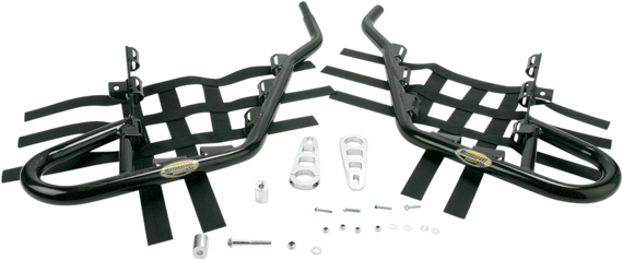Caracteristicas: Manufactured from lightweight 1-1/4" extruded aluminum tubing Custom EZ-fit clamp brackets with silver anodized finish Wide 1-1/2" black webbing with beefy aluminum net tabs Sweep up from front to the rear for maximum ground clearance Maximum width of 50" to comply with ATVA rules Allows the use of OEM heel plate/fender extensions
