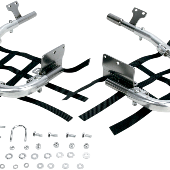 Caracteristicas: The latest in nerf bar technology combines lightweight aluminum tubing with high-strength steel brackets for the ultimate nerf bar 1-1/4" alloy tubes are heli-arc welded at the joints 4-gauge steel mounting brackets The highest tensile-strength webbing is used for maximum safety