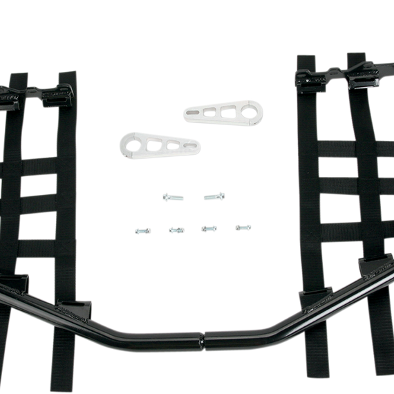 Caracteristicas: Manufactured from lightweight 1-1/4" extruded aluminum tubing Custom EZ-fit clamp brackets with silver anodized finish Wide 1-1/2" black webbing with beefy aluminum net tabs Sweep up from front to the rear for maximum ground clearance Maximum width of 50" to comply with ATVA rules Allows the use of OEM heel plate/fender extensions