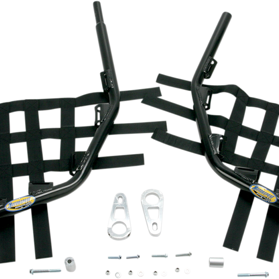 Caracteristicas: Manufactured from lightweight 1-1/4" extruded aluminum tubing Custom EZ-fit clamp brackets with silver anodized finish Wide 1-1/2" black webbing with beefy aluminum net tabs Sweep up from front to the rear for maximum ground clearance Maximum width of 50" to comply with ATVA rules Allows the use of OEM heel plate/fender extensions