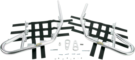 Caracteristicas: Manufactured from lightweight 1-1/4" extruded aluminum tubing Custom EZ-fit clamp brackets with silver anodized finish Wide 1-1/2" black webbing with beefy aluminum net tabs Sweep up from front to the rear for maximum ground clearance Maximum width of 50" to comply with ATVA rules Allows the use of OEM heel plate/fender extensions