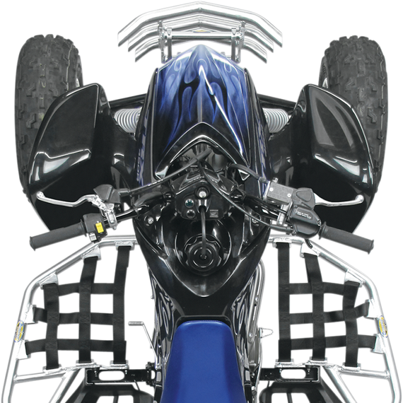 Caracteristicas: Manufactured from lightweight 1-1/4" extruded aluminum tubing Custom EZ-fit clamp brackets with silver anodized finish Wide 1-1/2" black webbing with beefy aluminum net tabs Sweep up from front to the rear for maximum ground clearance Maximum width of 50" to comply with ATVA rules Allows the use of OEM heel plate/fender extensions