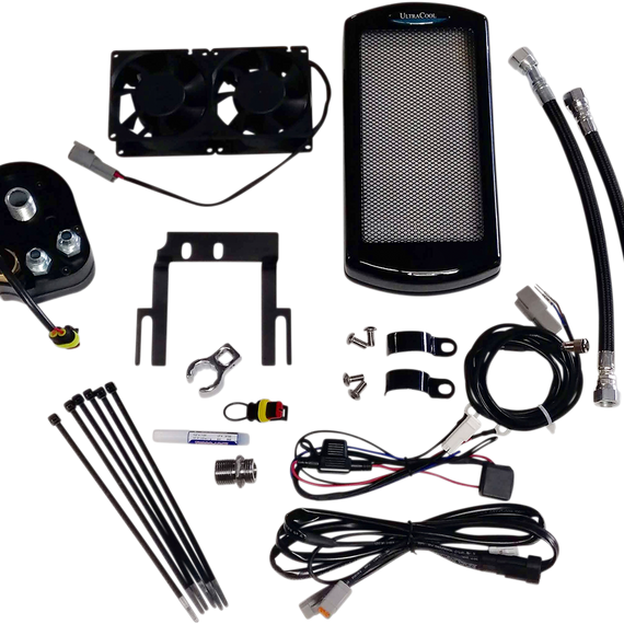 Caracteristicas: Sealed waterproof IP68 fans produce 220 CFM of airflow Oil adapter and thermal switch automatically turns on dual fans when your oil reaches 210°F Specifically designed aluminum heat exchanger with turbulators for maximum heat dissipation Plug-and-play wiring harness with relay and waterproof connectors connects battery under the seat for simple installation Black nylon coated stainless steel braided oil lines with AN6 fittings Specifically designed oil line fitting wrench Has the ability to drop oil temperature up to 50°F Complete kit; ready to install