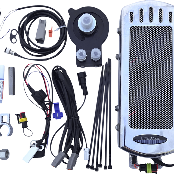 Caracteristicas: Oil Adapter and Thermal Switch with waterproof connectors automatically turns on the powerful dual fans when oil reaches 210 degrees Specially designed aluminum heat exchanger with turbulators for maximum heat dissipation Sealed Waterproof IP68 Dual Fans producing 220 CFM of airflow Plug and play wiring harness with relay and waterproof connectors that all connects to the battery under the seat for simple installation Black nylon coated stainless steel braided oil lines with AN6 fittings L.E.D. indicator light indicates when the fans are operating Special designed Oil Line Fitting Wrench and detailed instructions included