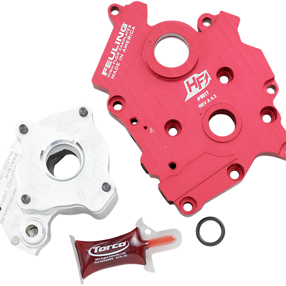 Caracteristicas: Increase oil pressure, oil volume, engine oil flow and return oil scavenging Quieter and smoother engine operation 15-25 degree cooler engine temperatures 15-30 degree cooler oil temperatures 10-30 more psi of oil pressure Reduces wet sumping, blow by and oily air cleaners Test results show 2 horsepower gain and 2 ft/lbs of torque gain to the rear wheel on M-Eight Feuling test results show as much as 50% reduction of engine sump oil level Includes a billet 6061 aluminum high-volume oil pump and Feulings® High Flow billet camplate made from 7075 aluminum; which is 50% harder and stronger than the factory or Feuling OE+ camplates Increases oil flow and volume by enlarging the oil pump reservoirs and critical oil passages including matching the oil portholes throughout the camplate to the portholes in the engine case which increases engine oil flow to the lifters, piston cooling jets, crankshaft and rod bearings Oil pumps are bench-tested; the relief valve is seated and sealed to a minimum of 30 psi with full pop-off at 55-60 psi Increased oil volume from the larger gears and properly sized passages along with the pressure relief valve seat and seal from these oil pumps is essential for proper oiling system function Feuling oil pump and camplate combination eliminates common pressure and scavenge issues associated with the factory oiling systems 30% more pressure gear volume over stock, 53% more scavenge gear volume over stock and 42% more scavenge volume with port sizing, matched passages and holes to the engine case Made in the U.S.A.