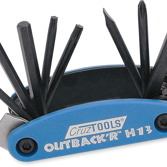 • Inside the fold-up handle are 3 hex keys (5/32", 3/16" and 1/4"), 2 Torx® keys (T25/T27), slotted and Phillips screwdrivers, a socket driver with 3 sockets (3/8", 7/16" and 1/2"), a 12-point 10 mm box wrench for battery terminals, a 9/16" open-end wrench and a spoke wrench