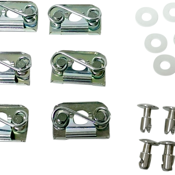 • Each kit contains six fasteners and all supporting hardware including anti-scratch washers, rivets and springs or clips