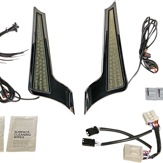 Caracteristicas: 45 super bright dual color LEDs on each side illuminate to function as additional red running & brake lights with full contrast amber turn signals Completely sealed behind a smoked lens Units adhere to each side of the rear fender fascia with double sided tape and include a plug and play wire harness for a simple install
