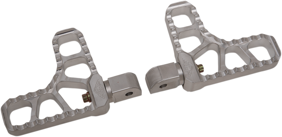 Caracteristicas: CNC-machined from solid 6061 aluminum Super strong, yet light-weight 2-piece construction The comfortable serrated foot surface area gives you a wider area for your feet and provides a good "bite" onto the bottom of your shoe Full 360-degree foot peg rotation makes these perfect for any application Have an exclusive pitch adjustment screw that enables change to the angle of the peg in order to adjust it to a "level" riding position (if necessary) so the pegs don't appear to "lay down" with time, vibration, etc.
