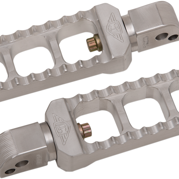Caracteristicas: CNC-machined from solid 6061 aluminum Super strong, yet light-weight 2-piece construction The comfortable serrated foot surface area gives you a wider area for your feet and provides a good "bite" onto the bottom of your shoe Full 360-degree foot peg rotation makes these perfect for any application Have an exclusive pitch adjustment screw that enables change to the angle of the peg in order to adjust it to a "level" riding position (if necessary) so the pegs don't appear to "lay down" with time, vibration, etc.