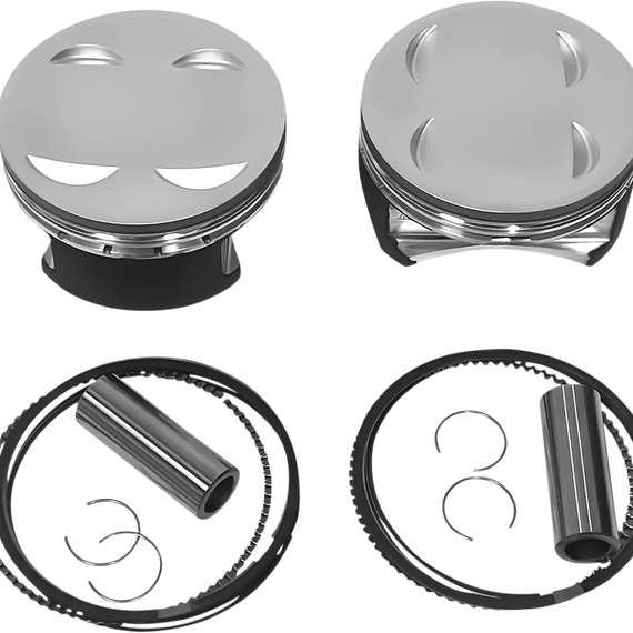 Caracteristicas: Top-quality custom-forged piston kits manufactured with high-strength aluminum alloy Include pistons with skirt coating, rings, chrome piston pins and retainer clips High-tech manufacturing ensures greater operating strength and lower expansion at high temperatures High-tension compression rings with 3mm oil scrapper rails Offset pin design for smoother operation Replacement ring sets sold as a set for one piston Made in the U.S.A.