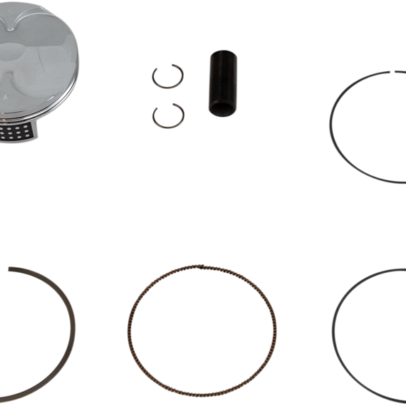 Caracteristicas: All pistons are heat treated with a T-5 hardening and tempering cycle All piston skirts are coated with a high-tech Molybdenum Disulphite coating for faster break-in time and increased piston life Cast piston kits are gravity cast aluminum alloy (not forged) with 18% silicone content, which produces an extremely light but very strong piston Forged pistons are forged from 2618 aluminum for superior strength and durability Forged High Compression pistons improve power and torque across entire rpm range Big Bore pistons increase engine’s displacement, torque, and peak horsepower Forged Replica pistons are forged OE replacements Replica pistons and all rings are OEM replacements Kit include piston, rings, wrist pin and circlips Replacement two-stroke piston rings sold individually; four-stroke piston rings sold as a set as needed Top End Kits include Piston Kit and a Top End Gasket Kit, top-end bearing and cam chain.