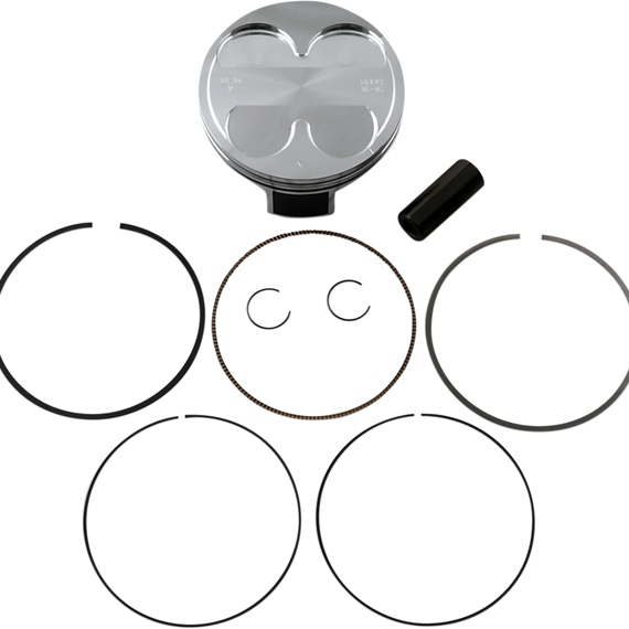 Caracteristicas: All pistons are heat treated with a T-5 hardening and tempering cycle All piston skirts are coated with a high-tech Molybdenum Disulphite coating for faster break-in time and increased piston life Cast piston kits are gravity cast aluminum alloy (not forged) with 18% silicone content, which produces an extremely light but very strong piston Forged pistons are forged from 2618 aluminum for superior strength and durability Forged High Compression pistons improve power and torque across entire rpm range Big Bore pistons increase engine’s displacement, torque, and peak horsepower Forged Replica pistons are forged OE replacements Replica pistons and all rings are OEM replacements Kit include piston, rings, wrist pin and circlips Replacement two-stroke piston rings sold individually; four-stroke piston rings sold as a set as needed Top End Kits include Piston Kit and a Top End Gasket Kit, top-end bearing and cam chain.