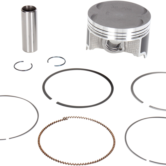 Caracteristicas: Quality and construction that meets or exceeds OEM Feature improved E-clip design Contain piston, rings, pin and clips Additional rings available separately Order one per cylinder Skirts have a nonabrasive, expansion-retarding MOS2 coating to reduce heat and friction for added power and longevity MOS2 coating actually draws heat through piston walls and out the bottom Specially hardened tops add strength to ring grooves